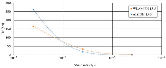 Time to failure (TTF) vs. strain rate of WLAM 15-5 PH and its counterpart AISI alloy.