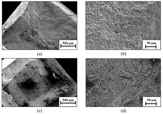 Fractography images of the tested alloys post-SSRT analysis at a strain rate of 2.5 × 10−7: (a,c) WLAM 15-5 PH alloy and (b,d) counterpart AISI alloy.