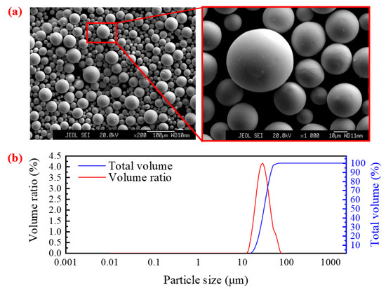 Spherical Ta powder (Suzhou Yaoyi New Material Technology Co, Ltd., Suzhou, China) with a purity of 99.99%, and a particle size ranging from 15 to 53 μm was used in our study. The chemical composition is shown in Table 1. Scanning electron microscopy (SEM, Zeiss Gemini 500, Jena, Germany) was used to observe the morphology of the powder particles (Figure 2a,b). The particle size was approximately normally distributed with D10 = 23.738 μm, D50 = 33.801 μm, D90 = 48.121 μm (Figure 2c). It took 5.91 s for 50 g of powder to naturally flow through a 2.5 mm hole to indicate good fluidity, which was conducive for uniform spreading of the powder during L-PBF forming.