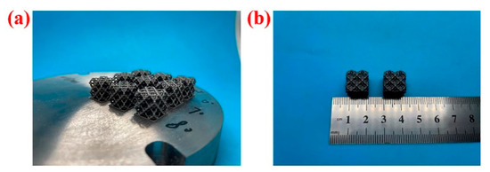 The diamond unit cell structure has excellent osteogenic effects and mechanical properties [1] and has been widely used in the design and fabrication of orthopedic implants. Here, a diamond cell structure was established by SolidWorks software (Dassault, France) with a porosity of 80%, a cell side length of 3 mm, and a strut diameter of 656 μm (Figure 1a). In order to minimize the size effect on the mechanical properties of the cell structure, we repeated the cell structure 4 times in every direction to form a block sample of 12 × 12 × 12 mm3 (Figure 1b,c).