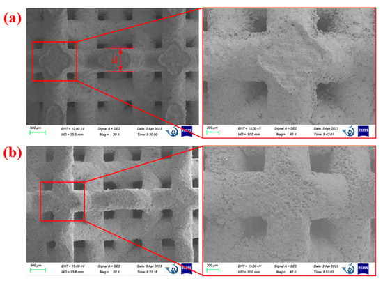 In the orthogonal experiment, the porous Ta samples prepared by Group 4 demonstrated the best mechanical properties, with compressive elastic moduli along the building and horizontal directions of 1.265 ± 0.006 GPa and 1.296 ± 0.015 GPa, respectively. Based on the above statistical analysis results, the optimal process parameters for the preparation of porous Ta were obtained (laser power: 180 W; scanning speed: 270 mm/s; thickness: 0.05 mm; scanning spacing: 0.07 mm). The same porous structure was fabricated using the optimal process parameters, and its microstructure and mechanical properties were evaluated compared to that of the samples in Group 4. The microstructure morphology of the porous Ta samples prepared by the optimal process is shown in Figure 9. After the sandblasting treatment, the adhesion phenomenon on the surfaces of the structure were significantly improved, and the transitions at the strut joints were relatively smooth.