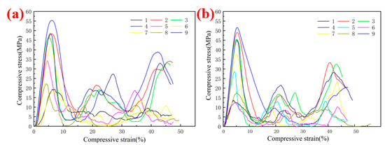 Compressive stress–strain curves of the typical porous Ta samples in (a) the building direction and (b) the horizontal direction.