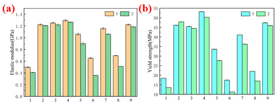 Figure 7 shows a comparison of the yield strength of the porous Ta with different process parameters in two compression directions respectively. Except for Groups 1, 6, and 8, with poor forming quality, the mechanical properties of the other groups were almost not affected by the compression directions. The elastic moduli of the porous Ta structures prepared with different process parameters were from 0.408 ± 0.004 Gpa to 1.265 ± 0.006 Gpa in the building direction, and from 0.499 ± 0.007 Gpa to 1.296 ± 0.015 Gpa in the horizontal direction. The yield strengths were from 13.554 ± 0.006 Mpa to 50.322 ± 0.055 Mpa in the building direction, and from 18.447 ± 0.052 Mpa to 53.217 ± 0.11 Mpa in the horizontal direction. As observed in Figure 7, the values of E (elastic modulus) and YS (yield strength) in the Z-axis direction were larger than those in the Y-axis direction. In fact, the forming quality of the samples in the Y-axis direction was higher with a larger strut diameter. The larger size error of the struts in the horizontal direction was caused by the difference in the scanning spacing and the influence of the laser spot size during the profile scanning of the porous structures in the preparation process, while the size of the struts in the building direction was only affected by the thickness of the powder layer. Therefore, the calculated elastic modulus in the building direction was generally slightly larger than that in the horizontal direction due to varied strut diameters in the horizontal direction resulting from the limitations of the forming process. We could see the porous Ta samples from Group 4 (laser power: 150 W; scanning speed: 270 mm/s; thickness: 0.05 mm; scanning spacing: 0.07 mm) demonstrated a mechanical performance superior to the others in both the building direction (1.265 ± 0.006 Gpa) and the horizontal direction (1.296 ± 0.015 Gpa), as shown in Figure 6 and Figure 7. The Group 4 samples had larger powder layer thickness and scanning spacing compared to the other samples, due to the presence of porosities in the porous structures, and the high level of heat generated inside the melt pools during the preparation process was more easily dispersed. The results show that the samples prepared by the process parameters in Group 4 had higher forming quality and fewer defects, such as cracks.