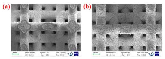 SEM micrographs showing the microscopic porous structure of the Ta scaffolds along (a) the building direction and (b) the horizontal direction.