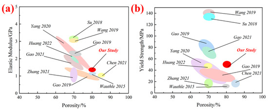 Mechanical property comparisons of the porous Ta scaffolds between our study and previous studies in (a) elastic modulus and (b) yield strength (data from Refs. [10,19,30,31,32,33,34,35,36,37,38]).