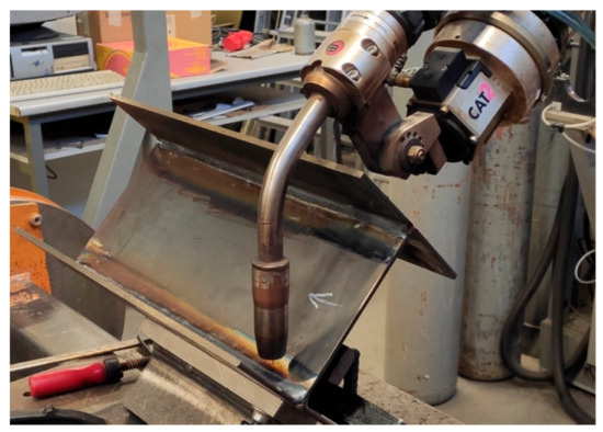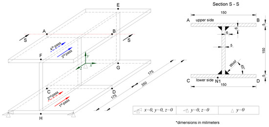 Using the OTC Daihen Almega AX-V6 robotic welding station with the Daihen Varstroj WB-P500L power source, three steel plates of equal dimensions were welded to form an I-profile structure. The plates were produced from low-carbon steel 10025-2: S355J2+N, whose thermal and mechanical properties dependent on temperature and chemical composition were given in an earlier study [27]. The dimensions of the plates were 350 mm × 150 mm × 5 mm3. The plates were welded free, without mechanical stiffeners. The complete plates’ geometry and welding set-up are shown in Figure 1 and Figure 2. The MCAW welding procedure was completed without a gap between the plates. A working technique with a neutral welding gun inclination and tack welds at the beginning and end of each welding pass were used. The entire process of three-plate welding was performed in four single passes. All four passes were in the same direction with an intermediate cooling time of 180 s. The welding parameters were selected as follows: current 330 A, voltage 35 V and welding speed 10 mm/s. For welding, a wire with a diameter of 1.2 mm classified as EN ISO 17632-A: T 46 2 M M4, a shielding gas composition in accordance with ISO 14175: M24 (93%Ar/6%CO2/1%O2) and a gas flow of 20 L/min were chosen. The chosen type of welding wire ensures that the hydrogen content inside the weld does not exceed the amount of 5 mL H2/100 g. To ensure uninterrupted metal transfer without spattering and without short circuits, a pulsed current was used.