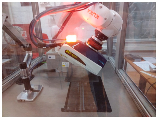 After finishing the welding of the I-structure and cooling to ambient temperature, residual stresses were measured on the upper and lower sides of the model using the cosα X-ray diffraction method [28,29,30] (lines A–B, C–D, E–F and G–H, Figure 1). The X-ray measurement was performed with the device Pulstec μ-X360 (from Pulstec Industrial Co., Ltd., Hamamatsu, Japan) shown in Figure 3. The first measurement was carried out at a depth of 0.005 mm below the surface and showed quite large deviations and scattering of the results compared to the numerical simulation. The reason was probably the partial corrosion of the plate surfaces and the presence of residual stresses created during the manufacture of the plates. After that, residual stresses were measured at a depth of 0.015 mm, with the previous application of the electropolishing technique using the EP-3 device (from Pulstec Industrial Co., Ltd.), which achieved a good match between the experimental and numerical results.