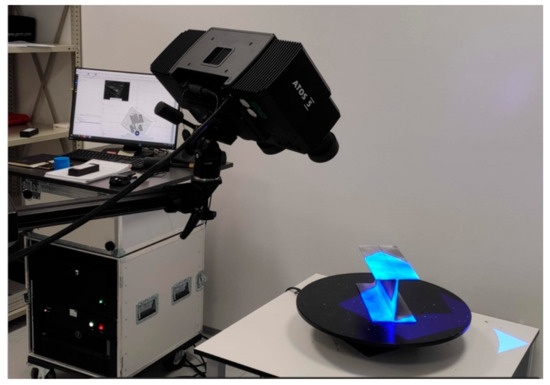 The ATOS 5 12M XL (from GOM Metrology, Braunschweig, Germany) optical measurement system was used to measure I-profile deflections after welding, whose main characteristics are given below. Using advanced camera technology, a powerful light source and high-performance software, this system offers exceptional performance, especially when measuring challenging surfaces such as shiny and dark materials, intricate structures and edges. This technology significantly accelerates the measurement process while ensuring the accuracy of 3D data acquisition. The ATOS 3D optical scanner uses a triangulation method that employs a stereo camera integrated into the system sensor head and a projection unit. During the scanning process, the system uses fringe projection with a blue light equalizer to ensure the highest data quality. The sensor projects various fringe patterns onto the surface of the scanned object. This system uses multiple phase shifts based on the heterodyne principle to achieve exceptional sub-pixel accuracy. The collected points allow the tracking of the scanned object in the measurement space, correcting its orientation, and, finally, creating a 3D representation by joining the 2D images. During the process, the scanner must always have at least three reference points in its focus to ensure accuracy. In the case of our measurement, these reference points were restraint nodes (Figure 1). Since it is an industrial scanner, it is important to secure and stabilize the objects to be scanned. More about the applied method can be found in [31]. The measurement of deflections is shown in Figure 4.