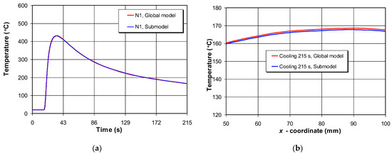 Figure 6a shows a comparison of the temperature histories of the arbitrarily selected point N1 (Figure 1) for the global model and the submodel, and it is evident that there are no deviations in temperatures. Figure 6b shows the temperature profile of the submodel and global model on the lower side of the I-profile (lines C–D, Figure 1), whereas the deviations are less than 1%. Temperature histories and cooling curves refer to the time 215 s from the start of welding, i.e., after completion of the first weld pass and 180 s of cooling. Since the temperature difference between the submodel and the global model is very small, it can be concluded that the mesh of the global model was well-designed for the case of thermal analysis.