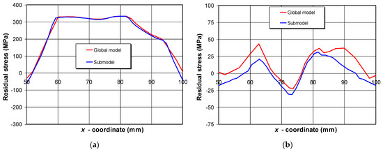 Figure 7a shows a comparison of the longitudinal residual stress (residual stress in the welding direction) of the submodel and the global model, and it is evident that the difference in the amount of stress is negligible. Figure 7b shows transversal residual stresses (stresses perpendicular to the welding direction) and it is evident that the difference in stresses is still acceptable. Both figures show the residual stress along lines C–D (Figure 1) on the lower side of the I-profile. Since the differences in the residual stresses of the global model and the submodel are within acceptable limits, it can be concluded that the mesh of the global model was dense enough and acceptable for the mechanical analysis.