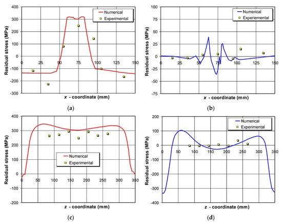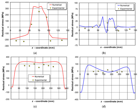 Figure 9a–d show numerical and experimental amounts of residual stresses on the lower side of the I-model, analogous to Figure 8a–d. It can be seen that the corresponding stresses are very similar on both the upper and lower sides of the model. The reason is that the cooling time between welding passes is large enough and is equal between each welding pass. Also, the height of the middle plate of the I-profile is 150 mm, which is a sufficient distance between the welds for the plates to cool down sufficiently before the next welding pass. Figure 10a,b show full-field distributions of the longitudinal and transversal residual stresses after numerical simulation.