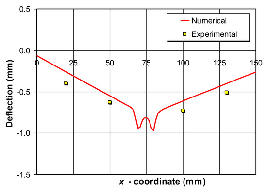 Figure 11 shows the deflections of the I-profile on the lower side of the model (Figure 1) along lines C–D on the lower side of the model. The measured deflections are about 12% higher compared to the numerically obtained values. The reason for the deviation can be attributed to the simplified heat-flux model used, which is very expressive when welding thin plates. The same reason leads to the deviation of numerical and experimental stresses.