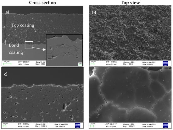 Top view and cross section SEM analyses of the thermal-sprayed sample: (a) cross section view of the thermal spray coating system at low magnification (the zoomed image shows the detail of bond coating), (b) top view analysis of the thermal spray coating at low magnification, (c) cross section view of the thermal spray coating in proximity to external surface, and (d) top view analysis of the thermal spray coating at high magnification.