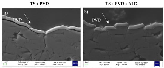 Detail of the near surface for both (a) TS + PVD and (b) TS + PVD + ALD coatings analysed by SEM.