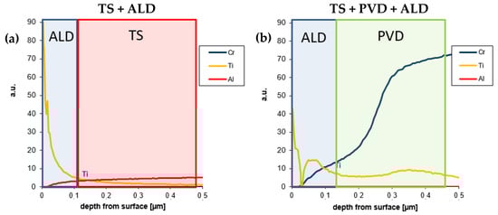 GDOES profiles for both (a) TS + ALD and (b) TS + PVD + ALD coatings.