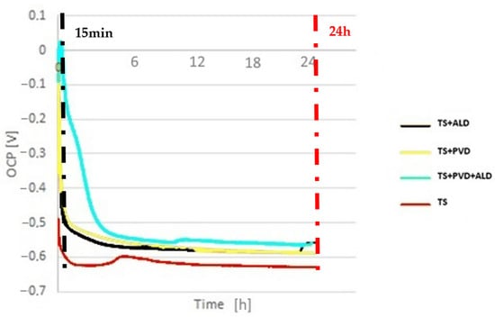 The samples analysed in this work were subjected to OCP measurements as a function of immersion time (Figure 5). Electrochemical tests were used to determine the barrier and sealing effects of the thin films on thermal spray discontinuities. The first evaluation was performed by means of OCP measurements. This analysis was necessary to determine the time necessary for the corrosive media to reach the steel substrate. In particular, the tests were performed by analysing the variation in the OCP, which decreased when the corrosive media reached the steel substrate.