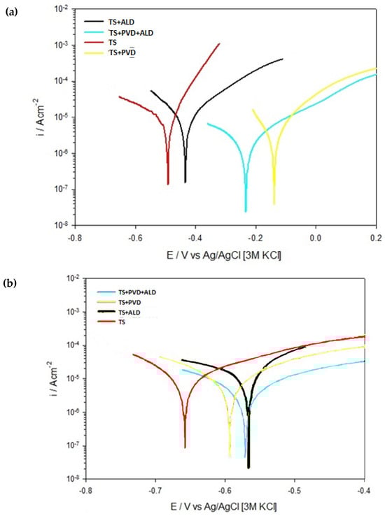The evaluation of the thickness of the corrosion products is in agreement with the finding in the analysis of the potentiodynamic curves. In addition, it was observed that the sealed specimens reduced the thickness of the corrosion products on the specimens subjected to the potentiodynamic test after 24 h of immersion. Again, the TS + PVD + ALD system showed the lowest thickness of corrosion products. Although the presence of thin films on TS coatings did not block the permeation of corrosive media, these films reduced the permeation of corrosive media and, thus, the corrosion process of the TS sample.