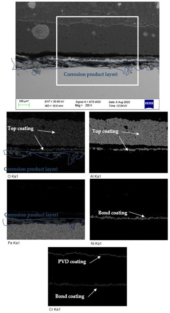 By analysing the potentiodynamic curves obtained from the samples immersed for 24 h, it is possible to observe some slight differences in the morphology of the anodic curve. In fact, a qualitative analysis of the anodic part of the potentiodynamic curve shows that the corrosion currents are lower compared to the same samples tested after 15 min of immersion. This behaviour is probably related to the fact that some corrosion products are produced at the interface between the bond coat and the substrate, as shown in Figure 7. These compounds are then partially covering the substrate surface in between the bond coating and the steel by partially protecting the underneath substrate. This corrosion morphology combined with the delamination of the coating is typical of thermal-sprayed coatings exposed to corrosive environments [30]. During the cutting of the samples, a strong delamination was observed for the sample coated with only the thermal spray coating.