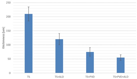 The ALD layer has a thickness of about 100 nm in both samples analysed. For the TS + ALD coating, the titania layer is close to the outer surface, whereas for the TS + PVD + ALD coating sample, the presence of a Ti signal can also be observed inside the PVD coating. This is probably related to the presence of droplets that altered the surface morphology and, thus, the detection of the ALD layer (the roughness effect [29]). A slight permeation of the ALD deposit in the TS coating is present. In this case, the evaluation by means of RF-GDOES profiles was not very accurate because the analysed area was too large in respect to the detected area.