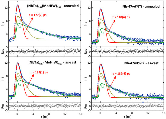The PALS spectra for both annealed and as-cast samples of (NbTa)(MoHfW) and Nb-47wt%Ti are shown in Figure 2. Similar to our previous studies [3,4], all PALS spectra are described by three exponential components, characterized by the mean positron lifetimes and their intensities . The component with the highest intensity and the shortest mean lifetime is identified as the component resulting from the annihilation of electron–positron pairs in the bulk of the test material. On the other hand, the other components with intensities of and much longer mean lifetimes ps and ns correspond to annihilation in the positron source and the Hostaphan foil.