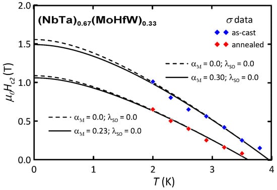 where , , , and is a digamma function. The solid lines in Figure 5 are the theoretical curves simulated with Equation (2), which we found to be the best fit to the experimental data. For both the as-cast and the annealed samples, the spin–orbit scattering constant was found to be negligible, so it was set to 0. In the case of the other parameters (i.e., the critical temperature and the Maki parameter), we found a significant change: from , K for the as-cast sample to , K for the annealed sample. The observed reductions result in a decrease in from 1.5(1) T to 1.1(1) T before and after sample annealing, respectively. For comparison, the theoretical curves calculated assuming the absence of the spin-paramagnetic effect and the spin–orbit scattering ( and [32]) are shown as dashed lines.