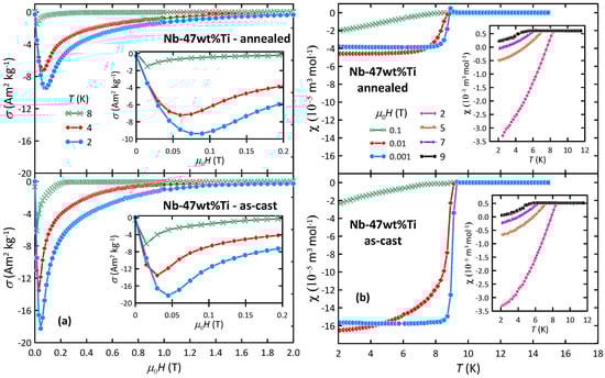 Low-temperature magnetic properties of Nb-47wt%Ti: (a) DC mass magnetization as a function of the applied field measured at various temperatures, (b) temperature dependence of the molar magnetic susceptibility in various applied fields.