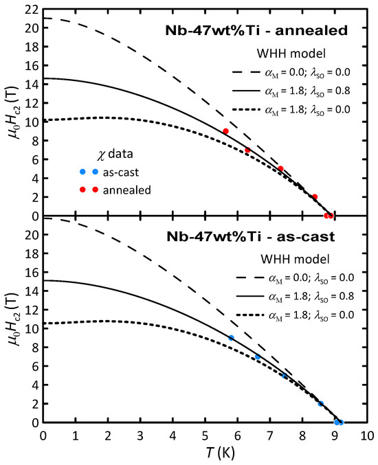 As was shown, in the case of Nb-47wt%Ti, the thermal treatment does not affect the value of the Maki parameter. The and fields determined using Equations (3) and (4) are equal to T and T for the as-cast sample and T and T for the annealed alloy. These values clearly show the dominant Pauli-limited behavior in the studied Nb-47wt%Ti alloy. Moreover, the influence of the structural defects on the superconducting properties of the studied materials is rather small.
