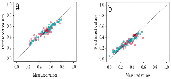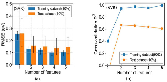 (a) The average RMSE of 500 random divisions for the training and test datasets of the multidimensional feature SVR model. (b) The cross-validation R2 of the best-performing model of the SVR model [23].