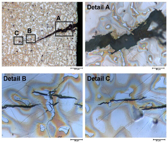 In atmospheric and aquatic environments, magnesium alloys can experience stress corrosion cracking (SCC) under the influence of mechanical stress, with cracks extending intermittently. When in an anodic solution, the cracks continue to propagate. These are two manifestations of stress corrosion cracking (SCC) in magnesium alloys. However, pure magnesium is not affected by this [36]. The detailed information on stress corrosion cracking (SCC) of AZ91 magnesium alloy at a strain rate of in double-distilled water is shown in Figure 7.