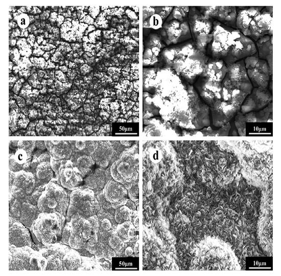 The SEM images of the striped surfaces after immersion in Hank’s solution for 14 days: (a,b) crystalline Mg65Zn30Ca5; (c,d) amorphous Mg65Zn30Ca5 [40].