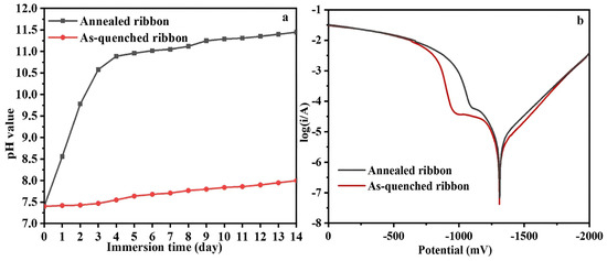 The evolution of pH over the first 14 days is shown in Figure 9a. Since both quenched and annealed strips were immersed in Hank’s solution, for the annealed strips, the pH of Hank’s solution increased sharply from 7.4 to 10.5 within the first 3 days due to the rapid degradation of the less corrosion-resistant annealed alloy. After 14 days, the low pH value indirectly indicates that the degradation of the quenched thin strips is very slow, demonstrating higher corrosion resistance, which is a typical characteristic of amorphous materials.
