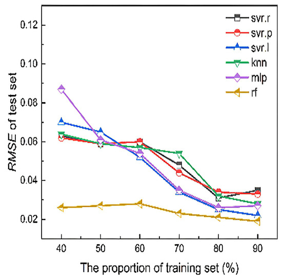 Firstly, in the selection of machine learning algorithms, they compared the performance of various machine learning algorithms, as shown in Figure 16. They divided the original dataset into training and test sets, with the former used for optimization and the latter for accuracy assessment. The training set was split from 40% to 90%, with the remaining portion reserved for the test set.