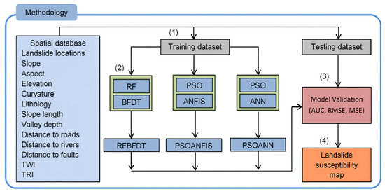 As shown in the figure, the first step involved generating training and testing sets using data from the study area, comprising 70% and 30%, respectively. Next, a hybrid model was used to build predictions related to landslides. This was achieved by combining the RF ensemble and BDFT classifier to create RFBDFT. Additionally, particle swarm optimization algorithm was combined with the ANFIS classifier to create PSOANFIS, and with the ANN classifier to create PSOANN. Then, several criteria were set to conduct hybrid validation. The training set was used to assess the model’s goodness of fit, and the testing set was used to validate the model’s predictive capabilities. Finally, each landslide image within the study area was generated using the hybrid model. The use of hybrid modeling allowed for a more comprehensive analysis of various study areas, resulting in more substantial outcomes.