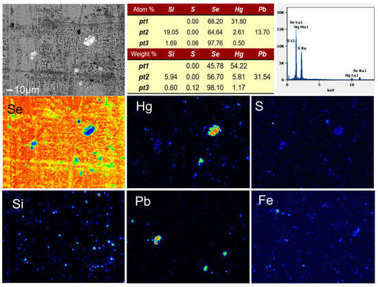The crude selenium used in this study was produced by the sulfation roasting of copper anode slime from a smelter in Shandong, China. The sulfurizing agents used in the experiment were sulfur powder, sodium sulfide, and ferrous sulfide chemical reagents. The purity of the samples was more than 99%, and the Hg content was less than 0.0001%. The content of metal impurities in the crude selenium sample was determined by inductively coupled plasma–atomic emission spectrometry (ICP-AES) and chemical titration (Table 1). The raw material contained 96.50% Se and 0.32% Hg. An EPMA image and the energy spectral analysis results of crude selenium samples are shown in Figure 1. The elemental impurities Fe, Hg, Pb, S, and Si are roughly located in the same positions, indicating that these impurities in the crude selenium show a certain degree of aggregation. The energy spectrum of each point is obtained by EPMA scanning and shows that the mercury mainly exists in the form of HgSe.