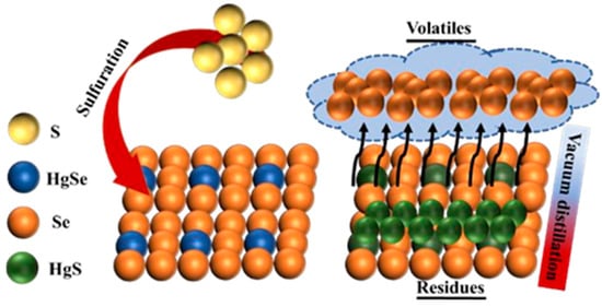 The above discussion demonstrates that it is reasonable to combine sulfidation with vacuum distillation for the removal of mercury from crude selenium to purify selenium. In addition, no selenium-containing aqueous solutions are used in this method for removing mercury from crude selenium, and the vacuum distillation method for removing mercury circumvents the accumulation of harmful substances (Hg, Se) in a closed environment. Although mercury removal via combined sulfidation and vacuum distillation has been studied in the laboratory environment, this process needs to be further studied as a continuous and automated process to produce corresponding cost-effective equipment for practical applications.