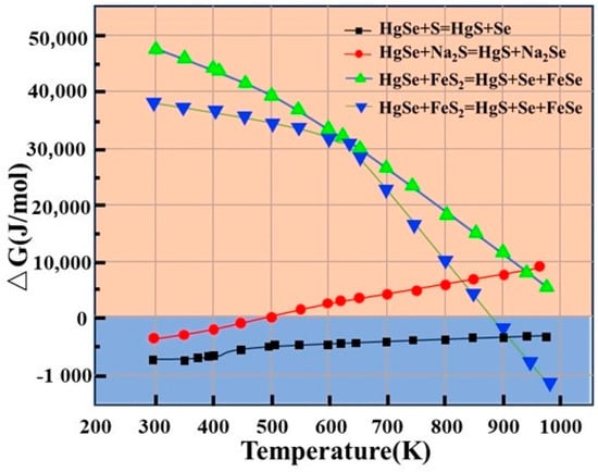 Three common curing agents, sulfur powder (S), sodium sulfide (Na2S), and ferrous sulfide (FeS2), are used in the curing process. The change in Gibbs free energy (△G) is an important basis for determining whether the substitution reaction occurs. When △G is negative, the reaction is spontaneous at constant temperature and pressure. In contrast, the reaction is nonspontaneous if the △G value is positive. △G can be expressed by Formula (1). The reactions of the three sulfidizing agents with HgSe are shown in Table 2. At the same time, the feasibility of decomposition of HgSe was considered, and the calculation results are shown in Figure 4.