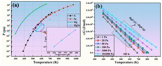 The volatilization characteristics of HgS produced in the sulfidation process and HgSe in the crude selenium were analyzed. Hg is obviously interdependent with Se and S, and S and Hg are combined for synthesis. This finding is consistent with the above thermodynamic calculations. The calculation results for the saturated vapor pressure of HgSe, Hg, Se and S are shown in Figure 5a. According to the relationship between the saturated vapor pressure and temperature of a material, the saturated vapor pressure of Se in the system is highest after sulfidation, and it volatilizes. When the temperature is 555 K, the saturated vapor pressure of Se is 16.56 Pa, and the saturated vapor pressure of the raw material HgSe is 2.7 Pa, which proves that the volatility of Se is far greater than that of HgSe. In other words, when the pressure is between 2.7 Pa and 16.56 Pa at 555 K, Se is in an unsaturated state, while HgSe is in a supersaturated state. At a similar saturated vapor pressure during the actual process, HgSe volatilized with Se in the vacuum distillation process. Therefore, HgSe changed to HgS and demonstrated the volatilization characteristics of HgS due to sulfidation. The conversion of HgS (s) into HgS (g) is shown in Figure 5b, and the change in Gibbs free energy for the reaction is greater than 0, which proves that it exists in a solid-state at 555 K and is not converted to gaseous molecules. It can be seen from the above analysis that a change in the vacuum conditions can induce Hg to remain in the residue of the vacuum distillation process as the sulfide product (HgS) and Se volatilizes in the molecular state to achieve crude selenium purification and the removal of Hg.