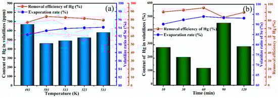 (a) The effect of distillation temperature on the content of Hg in volatiles and the removal efficiency of Hg; (b) the effect of distillation time on the content of Hg in volatiles and the removal efficiency of Hg.