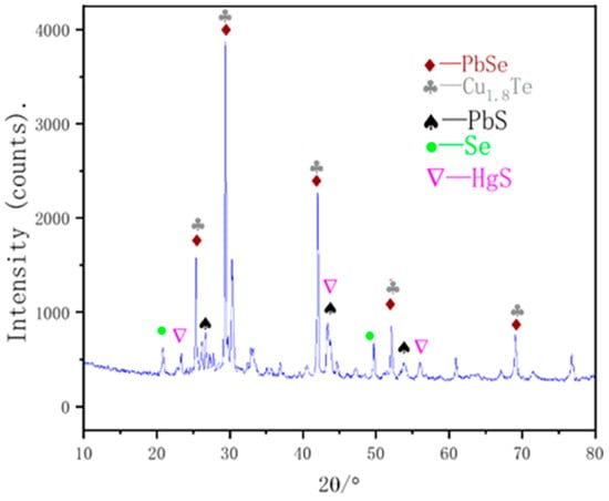 To determine the phase of mercury present in the vacuum distillation residue, XRD was performed, and the results are shown in Figure 7. The results indicate the presence of difficult-to-volatilize PbSe, PbS, and Cu1.8Te in the residue, as well as incomplete volatilization of elemental selenium. The presence of HgS and a decrease in the mercury content in the volatile matter indicates that HgSe does in fact react with elemental sulfur to generate HgS during the sulfurization reaction.
