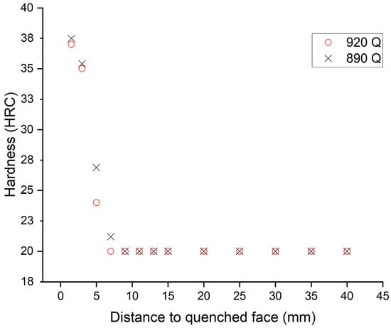 The quenching at 890 °C is slightly harder in the millimeters closest to the quenched face. For 9 mm and greater, the hardness of both quenching temperatures is the same and below the regular Rockwell C scale. The first 10 mm is where the drop in mechanical properties is most clearly observed.