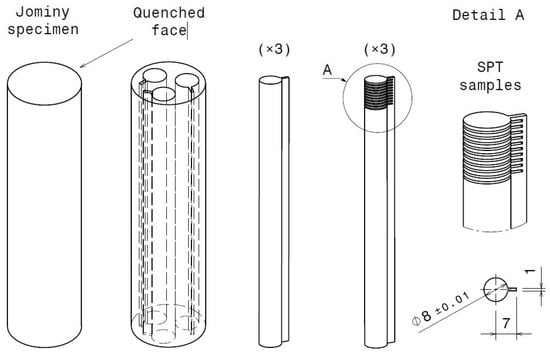The SPT samples were extracted from the tested Jominy specimens with the following methodology (Figure 2). The quenched end of the Jominy sample was marked for traceability. From each Jominy sample, three cylinders with a small “shoulder” along all the length were extracted with electrical discharge machining (EDM). The cylinders were 8 mm in diameter, with a shoulder of 1 × 3 mm and length of 100 mm. The shoulder was used to stop the SPT specimens from detaching from the cylinder during machining, thus allowing for their traceability. From each set of three cylinders, one was processed in quenched conditions, one was tempered at 620 °C, and the last one was tempered at 420 °C. The heat treatments for the total of six cylinders are summarized in Table 2. They have been coded in the table for reference in the results section.