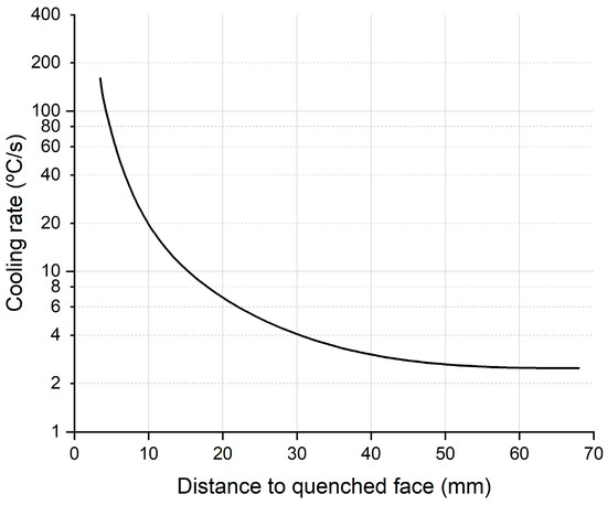 Regarding material conditioning and processing, the SPT has been reportedly used for studying the effects of neutron-ion irradiation [14], exposure to hydrogen embrittlement [15], thermal ageing [16,17], annealing [18], hot isostatic pressing [19], and thermal cutting [20]. These thermal ageing, annealing, hot isostatic pressing, and thermal cutting studies are related to the field of heat treatment. In this field, a high-throughput test known as the Jominy test is standardized in ASTM A255 and ISO 642 and allows the generation of materials that have been quenched at different cooling rates from a minimum material amount whose dimensions are Ø25 × 100 mm. The ability of screening quenching rates has proved to be valid for the traditional application of high-throughput tests, such as for alloy design [21]. The material characteristics that the Jominy test allows one to assess are hardness and microstructure for a broad range of cooling rates at a given temperature [22,23,24], which explain why this technique has been used not only for steels but also for non-ferrous alloys [23,24].