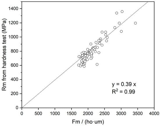 In Figure 4, the correlation for the tensile strength is presented. The data have been fitted with a straight line that passes through the origin, following the recommendations of ASTM E3205-20. This correlation, where represents the slope, is: