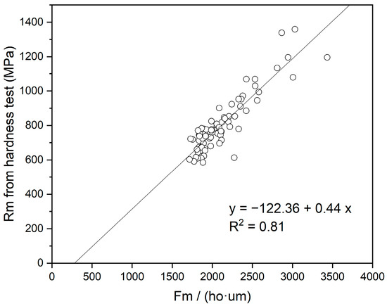 where and are material-dependent empirical constants. The empirical constant used to estimate the yield strength is obtained from the recommended value given by EN 10371, which for steels with RP0.2 values in the range of 200 MPa to 1000 MPa is 0.479, as is the case in this study. For the empirical constant , the values of the Vickers hardness number (HV) were obtained in each specimen with a Vickers micro-durometer (FM-700, Future Tech Corp., Tokyo, Japan), and with the ASTM E140 hardness conversion table, the tensile strength was obtained (see Table 4). The values of the tensile strength and Fm/(h0·um) are correlated, allowing us to obtain an equation to estimate the tensile strength from the SPT.