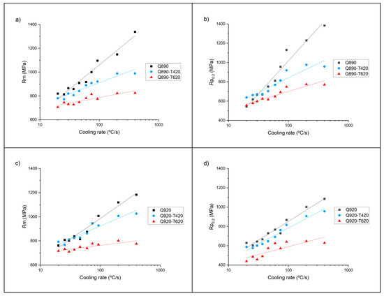 For the specimens quenched from 890 °C and their different tempering conditions (Figure 6a,b), differences in the mechanical properties, both Rm and RP0.2, can be observed for each cooling rate. This difference becomes greater as the cooling rate increases and decreases to almost equal the mechanical properties at slow cooling rates. The specimens quenched from 920 °C and their corresponding tempering conditions (Figure 6c,d) show a similar behavior to the specimens quenched from 890 °C. The mechanical properties of the samples subjected to the different cooling rates from 920 °C and those quenched and tempered at 420 °C are similar, and only small differences can be observed at high cooling rates. Also, the results compared between the different quenching temperatures for the same tempering conditions are shown in Figure 7.