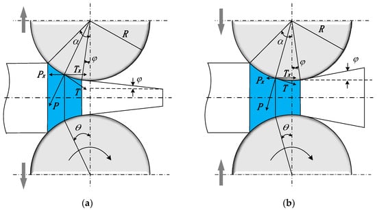 Within the sticking zone, the metal is relatively stationary to the roller in the horizontal direction. As shown in Figure 5a, the sticking zone is divided into two parts using the neutral angle as a boundary, and the directions of the horizontal components of the friction force on the contact surfaces of these two parts are opposite. The force expression is