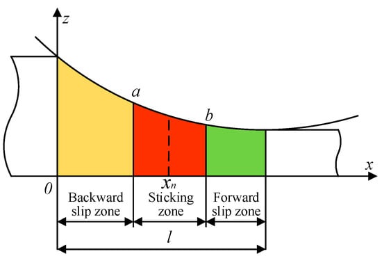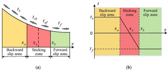 Due to the existence of the sticking zone, the calculation of the longitudinal lengths of the forward and backward slip zones is different from the calculation of the forward and backward slip zones’ longitudinal lengths in the full sliding model.
