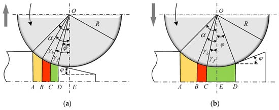 Considering the thickening rolling shown in Figure 6a as the object of study, it is known that the forward slip zone’s longitudinal length is line segment CD, and the backward slip zone’s longitudinal length is line segment AB. By solving for the geometric lengths of the various line segments in the figure, the expressions for the forward slip zone’s longitudinal length and the backward slip zone’s longitudinal length during the thickening rolling process can be obtained: