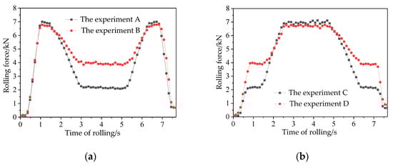 Graph of measured rolling force: (a) average rolling force measured in experiment A and experiment B; (b) average rolling force measured in experiment C and experiment D.