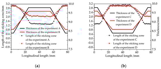 Graph of length of the sticking zone and thickness: (a) length of the sticking zone and thickness of experiment A and experiment B; (b) length of the sticking zone and thickness of experiment C and experiment D.